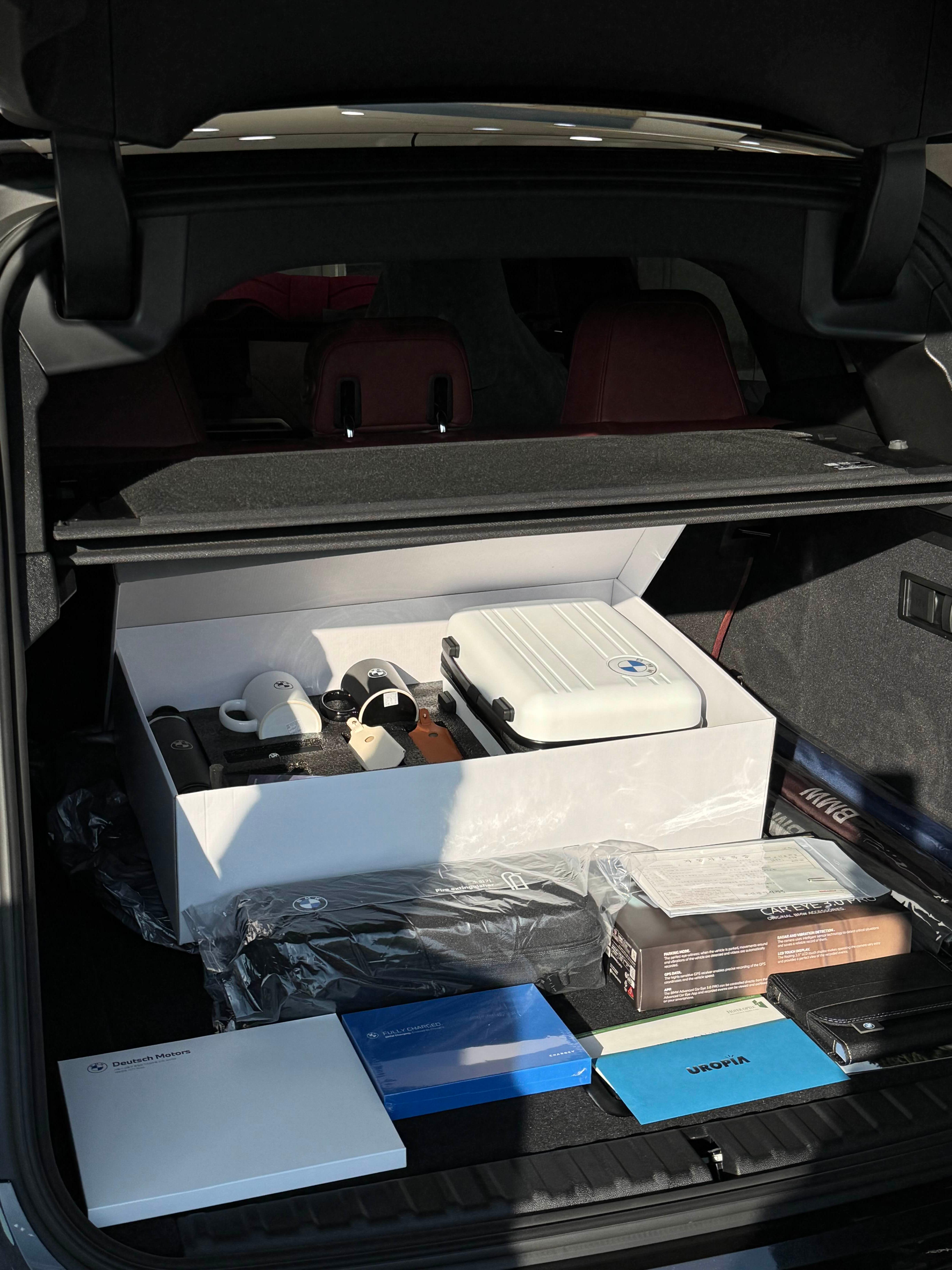 트렁크에는 기본 구성품들이 잘 정리되어 있었고, 담당 매니져님께서 필요한 부분을 하나하나 꼼꼼하게 설명해 주셨다. 실내 비닐을 벗기기 전의 모습도 설레었지만, 특히 시트 컬러 선택이 만족스러웠다. 평소 블랙 시트를 주로 탔기에 이번에는 변화가 필요하다고 생각했고, 레드 시트를 선택했다. 강한 레드가 아니라 브라운과 레드 사이의 깊은 톤이라 과하지 않으면서 고급스럽다.